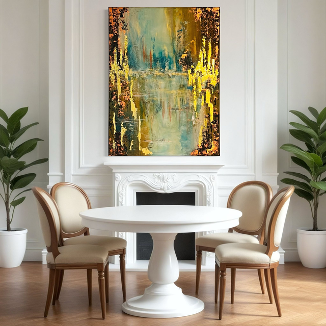 Description: Cette toile joue avec la lumière et la profondeur grâce aux nuances vibrantes de bleu, d’or et d’ocre. Les touches dorées et cuivrées créent un effet de reflet où le mystère et l'éclat se rencontrent. Métamorphose est énigmatique, riche en détails et amène cette touche d'élégance dans votre intérieur.
