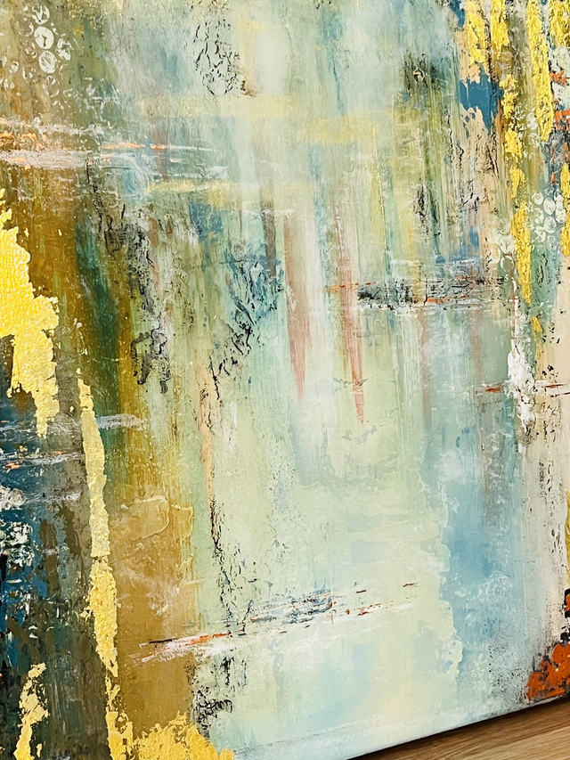 Technique: Acrylique, médium de texture, feuille d'or, au couteau à peindre et pinceau