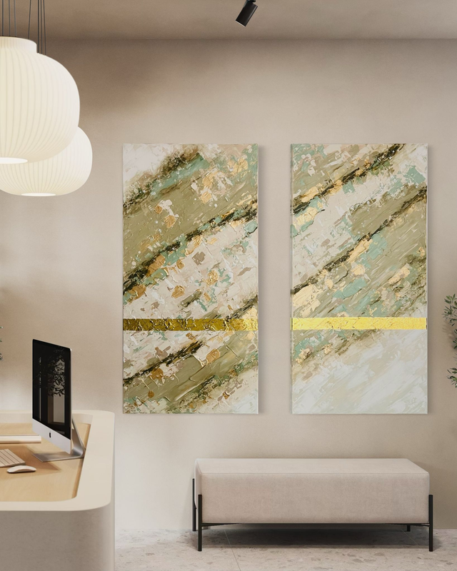 Description: Une oeuvre subtile créant un équilibre entre mouvement et sérénité. Ces deux toiles dialoguent entre elles par des touches dorées lumineuses et la douceur d'une jolie gamme de vert. Un jeu de matière et de lumière aux teintes naturelles apaisantes qui invite à une harmonie intérieure.